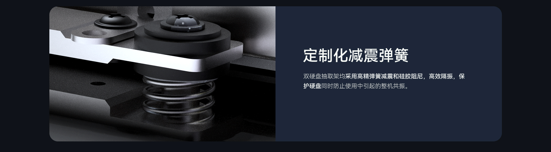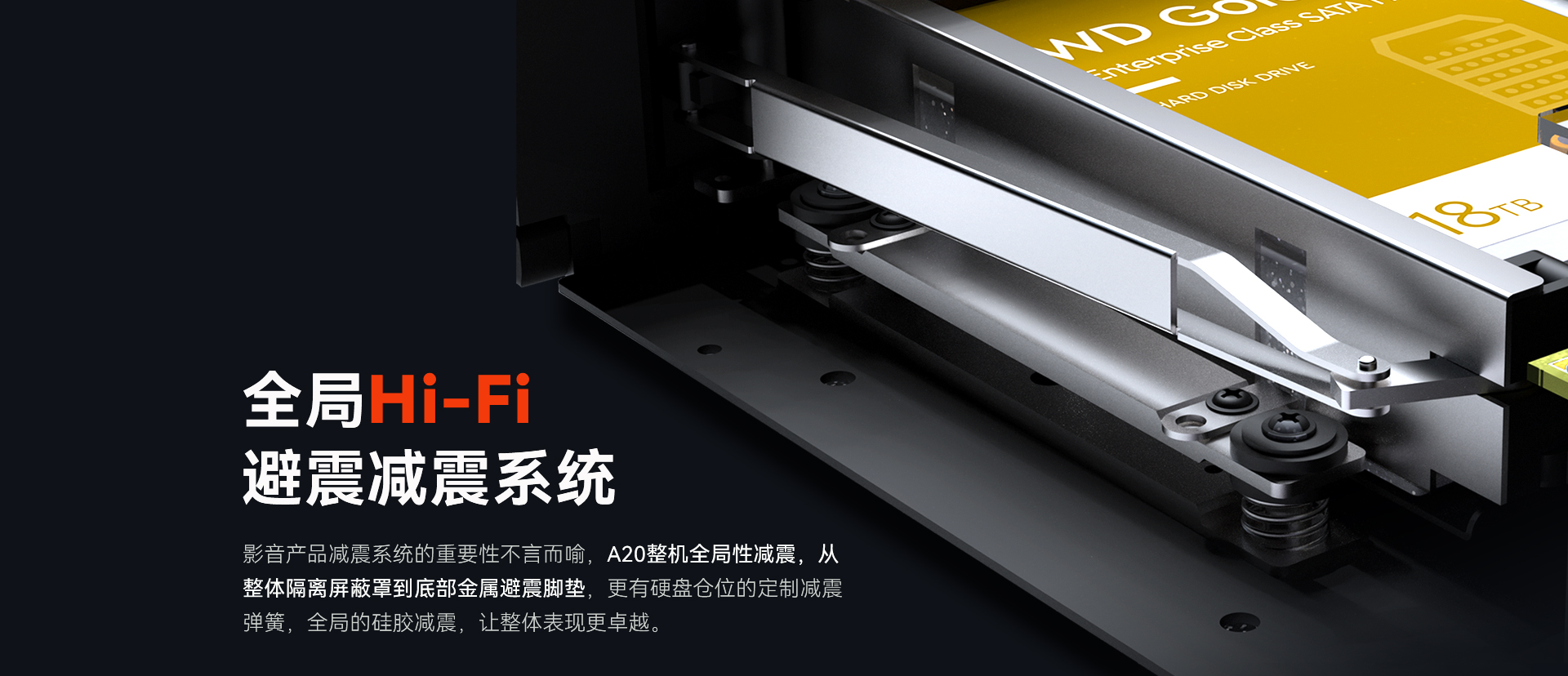 √ 整机专业级Hi-Fi设计理念,采用德国技术的定制化弹簧和铝基板对硬盘进行物理减震,使用滴水不漏的电磁屏蔽罩对干扰源进行隔离处理,对变压器和风扇进行硅胶减震,尽可能减少机器内部的干扰,为音画质呈现最佳的效果;